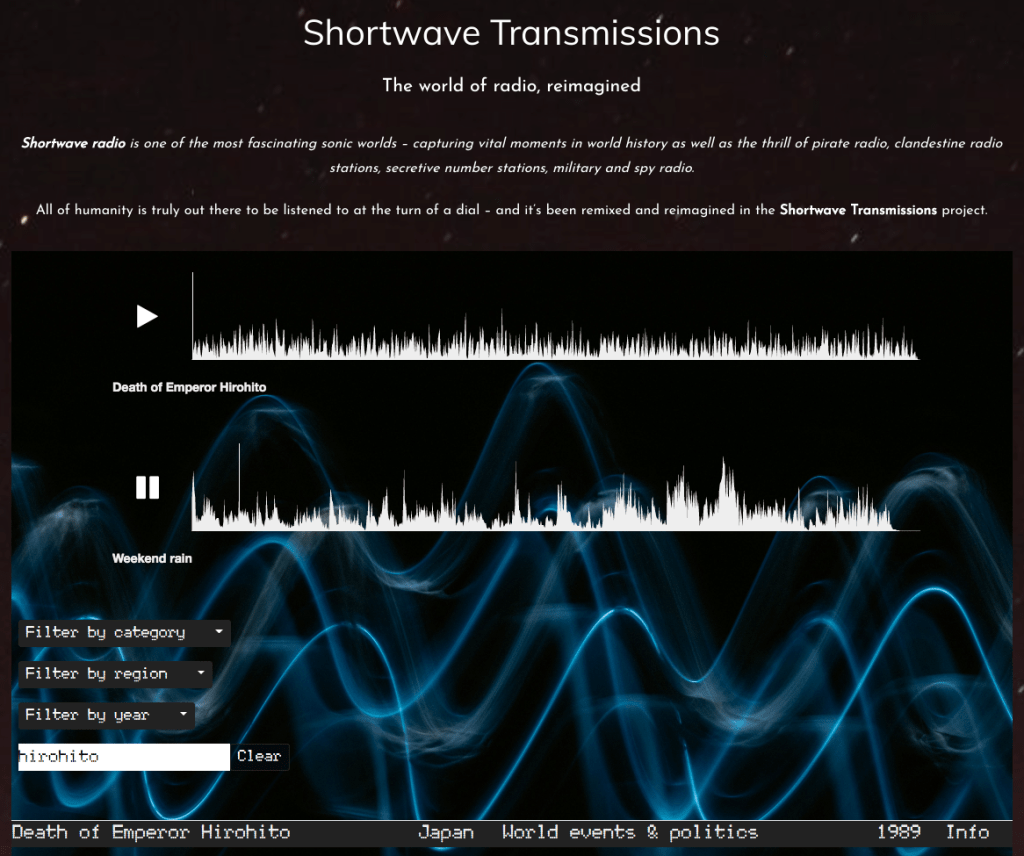 But not straying any further, my new electroacoustic work Weekend Rain had its premiere presentation at “Shortwave Transmission” by Cities and Memory on February 13th…on World Radio Day, nonetheless! Check out the project HERE—type “Hirohito” on the search bar to find my track. Radio NHK (Japan) broadcasted news of the Emperor Hirohito’s death in 1989, which became the departure point for this work. An excerpt of my program notes follows below: