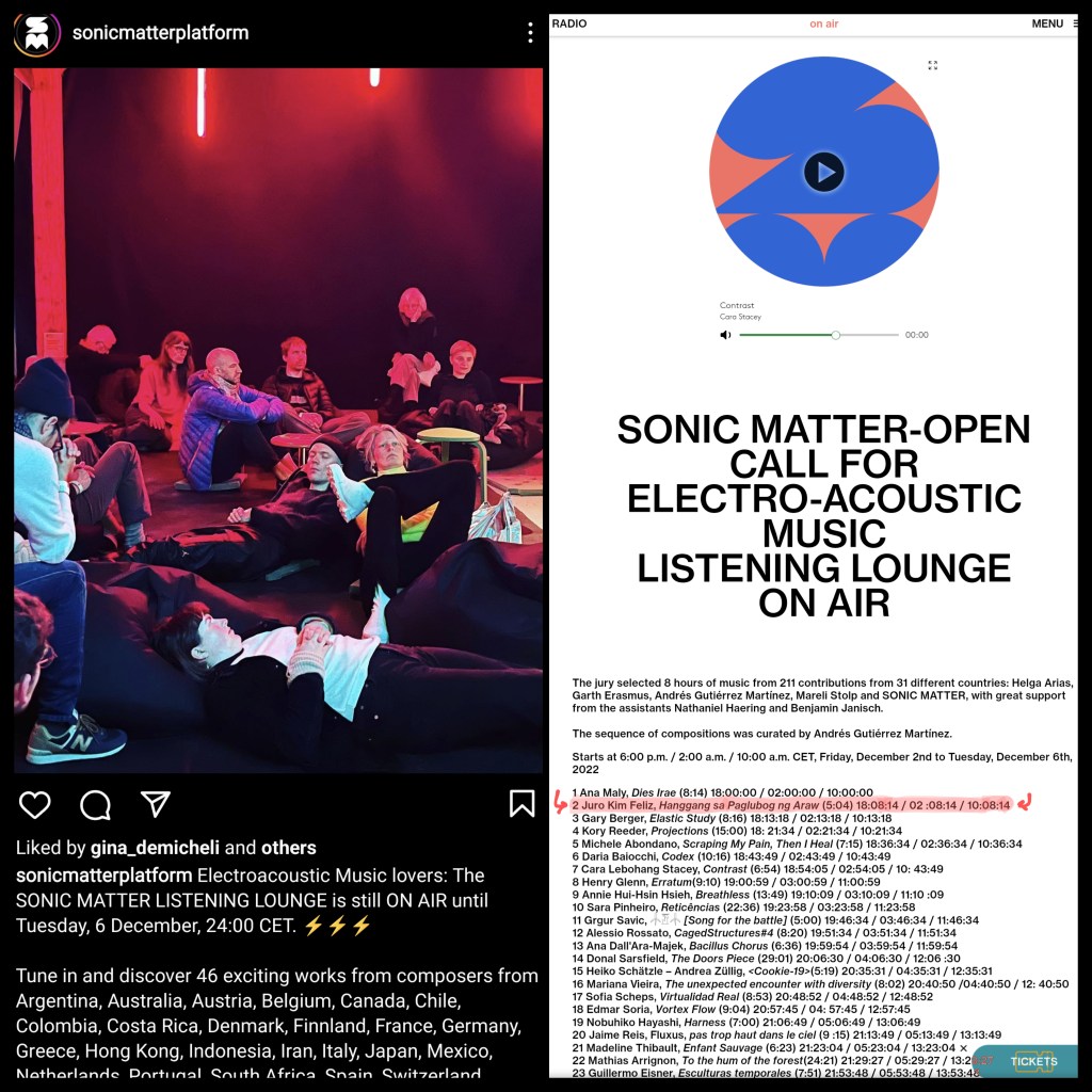 I made revisions of this work in 2021 for another piece of news I will most likely share next year. But it was to my surprise that SONIC MATTER Festival in Zürich eventually chose this among a huge list of works for their Listening Lounge. (It really seems that Switzerland just loves this particular work, eh?). It wasn’t a public live premiere of the piece per se, but the Listening Lounge featured a long playlist of works that attendees can slip into for relaxation and lounging. My work was heard throughout the duration of the festival on December 2nd to 4th in the Kunstraum Walcheturm, and they also featured the Listening Lounge in the festival’s online radio on December 2nd to 6th.