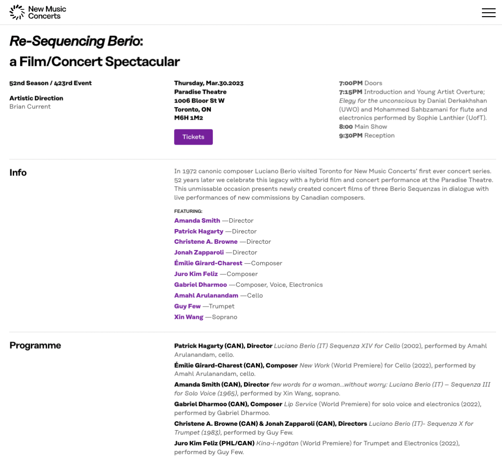 There was a reason why I named my Musicworks article as such. This article is part of a bigger project I conceived that contextualizes a “resequencing” of Luciano Berio’s selected Sequenze pieces. For a second commission from New Music Concerts, I was tasked to write a trumpet and electronics piece that responds to Berio’s Sequenza X (for trumpet and piano resonance).
