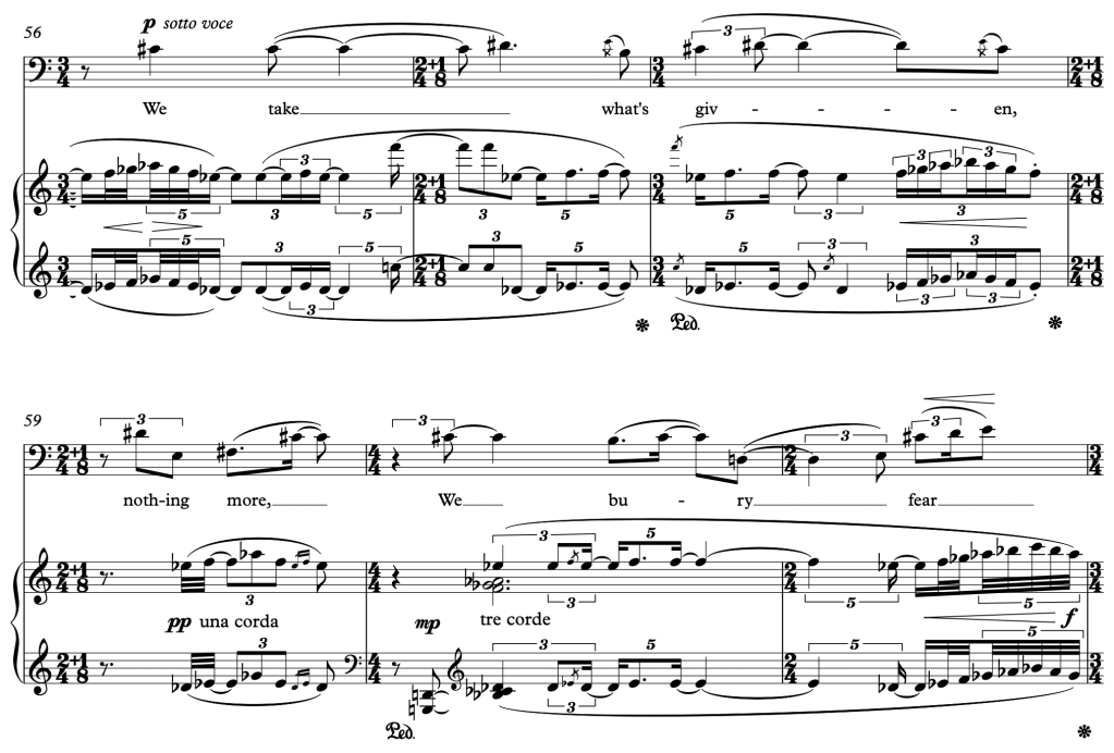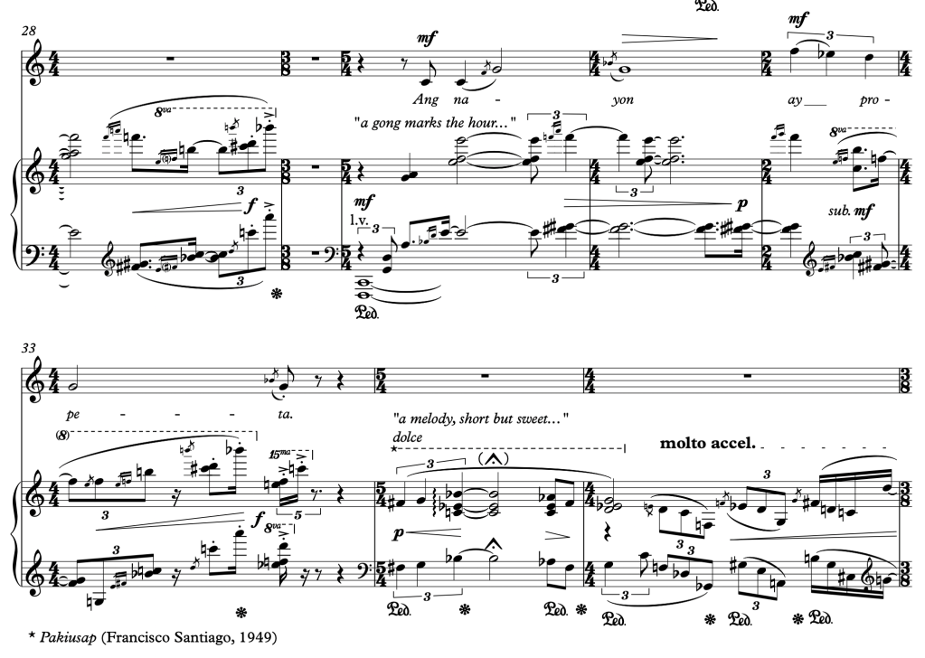 Firstly, the rhythmic impulses and treatment of time generally differ between the voice and piano. Vocal melodies are grounded in easily perceived beats, while the piano intentionally avoids sounding out regular pulsations in most parts. This creates tension between the rigid convenience of musical time in the voice and a fluid elusiveness in the piano — a theatricality that becomes painstakingly evident when performed live. Upon first hearing, a student of mine pointed out this resulting ambiguity to me: “They both sound out of alignment and yet they are obviously aligned.” The gamelan and kulintang ensembles behave naturally like that, so why not a song cycle?