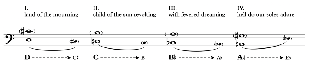 Most importantly, both vocal and piano sound worlds embody independent trajectories. The vocal world roots itself a major seventh above/minor second below an art song’s designated tonal centre that the piano passages emulate. The first art song begins with the piano building its world on a D tonal centre, while the vocal melody first takes off from C-sharp. Other art songs follow this system. The “basso lamento” figure shown above demonstrates this structure, notated in parenthesis above the bass line. This detachment opens up the possibility of polytonality — superimposing two musical environments over each other at the same time — something I explored (albeit not fully fleshed out, I admit) in the third art song.