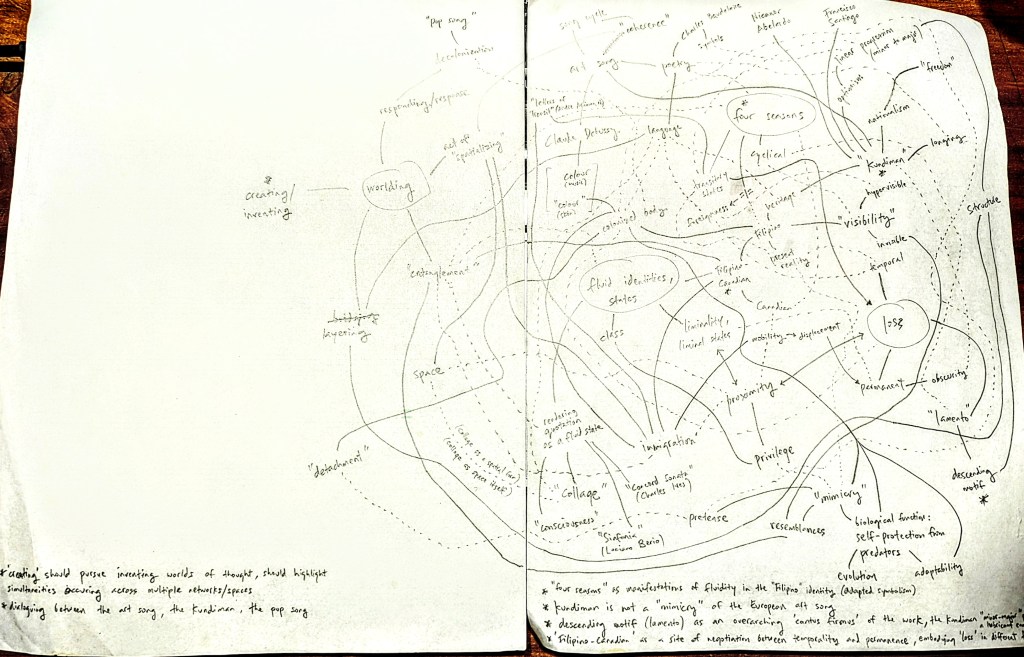Vocal melodies generally sound very tonal, as if the singer simply sings cutouts of pre-existing songs. Contrastingly, the piano soundscapes bring out unapologetic dissonances, quirky angular turns, and shifting tectonic plates. The piano behaves like a soloist that the singer has to sing alongside with. These polarities provide me with the freedom of building musical collages with the piano, creating a new spatiality with the juxtaposition of my sonic impulses, kundiman melodies, and even pop-sounding tunes. The collage-making casts a non-diegetic element over the singer’s world as the singer remains unaffected with these outrageous outbursts of musical activity — akin to actors on a film’s interior world being oblivious and detached to the music score that accompanies their narrative’s unfolding.