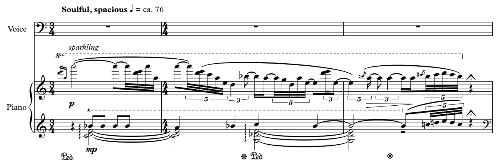 Of all the art songs of Liham, this third one contains music that has the most straightforward rhythmic pulse that unites both voice and piano. Triple metre pervades these refrains and sets a walking pace. Stretching the second beat doesn’t always translate to a waltz — a calculated unevenness drags the pulse like cautious, dragging feet lest a misstep causes a slip on the ice. We hear the rhythmic motif of a duck walk. Creating more varied unevenness from this motif pries a landscape open and stretches it, akin to characterizations of sparse Canadian landscapes. Observing this emerging correlation between geography and the music of Canadian composers, Elaine Keillor (2006) notes an encultured understanding as Hungarian-born Istvan Anhalt internalizes Canada’s disjunct, expansive territories in his music. During my studies at McGill, a percussionist described this attitude succinctly to me: “Canadians love their space, literally and figuratively.”