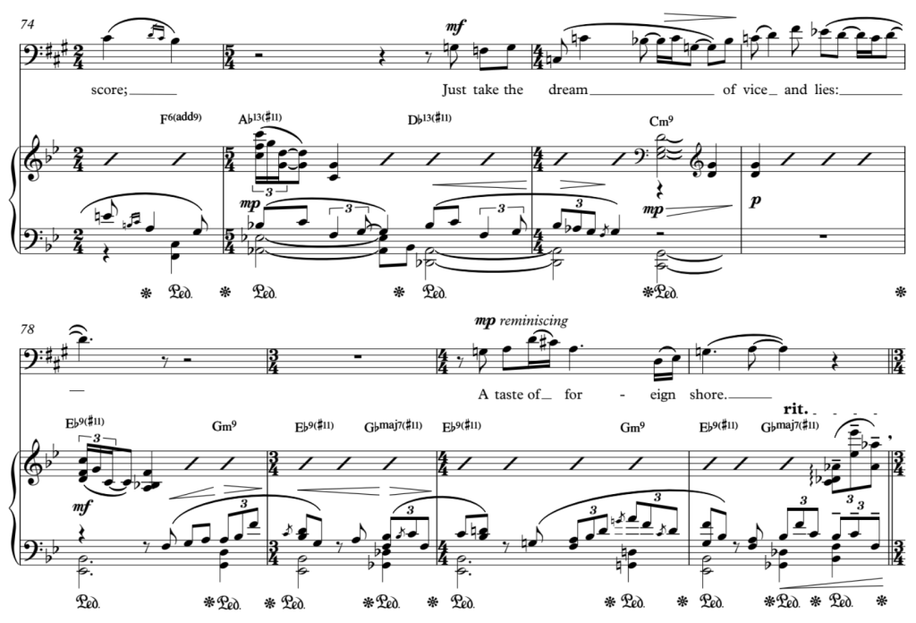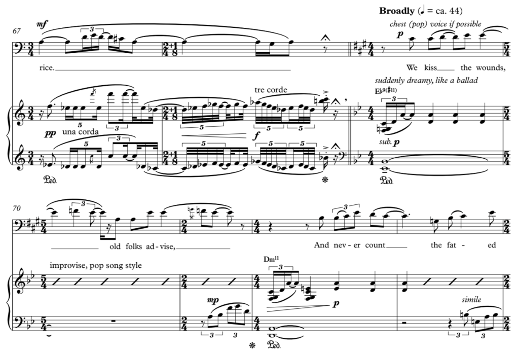 The delirium takes a postclassical turn. A pop ballad suddenly emerges. A fork on the road. The narrator takes the obvious route, staying put within their nice little world. The piano takes a separate one. Bitonality occurs, as two musical entities suddenly inhabit two different musical keys at the same time. The narrator sings in A major, while the piano conjures a key in B-flat major starting on the subdominant E-flat. The resulting landscape rests on neither side of the coin, continually oscillating as both musicians stick within their chosen paths. The notated score’s two fighting key signatures ensure that they do so.