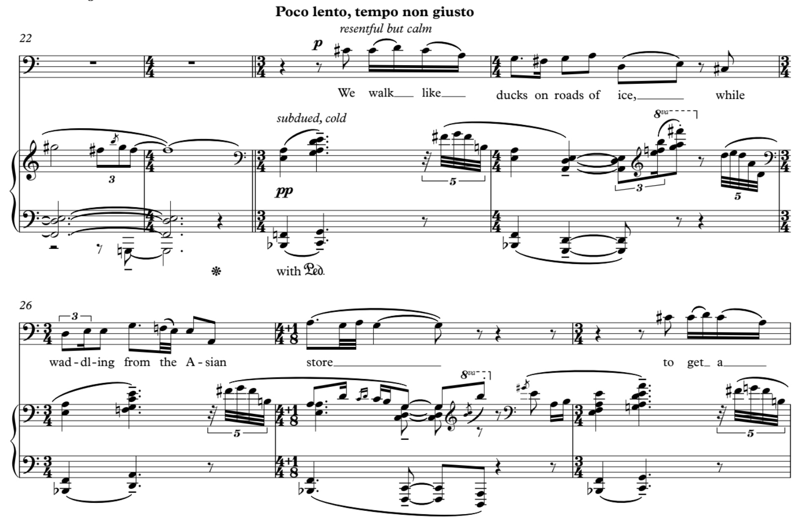 A polar vortex casts its freezing spell over the land again; a feverish dreamscape of tropical home ends. Badingham’s libretto ends on that reflection, making a turn back to homesickness. The child of poverty — Anak Dalita — makes a final appearance, still wearing the mask of a major key. The duck walking returns, now oscillating between A-flat major and D major. The clashing key signatures linger on with no resolution in sight.