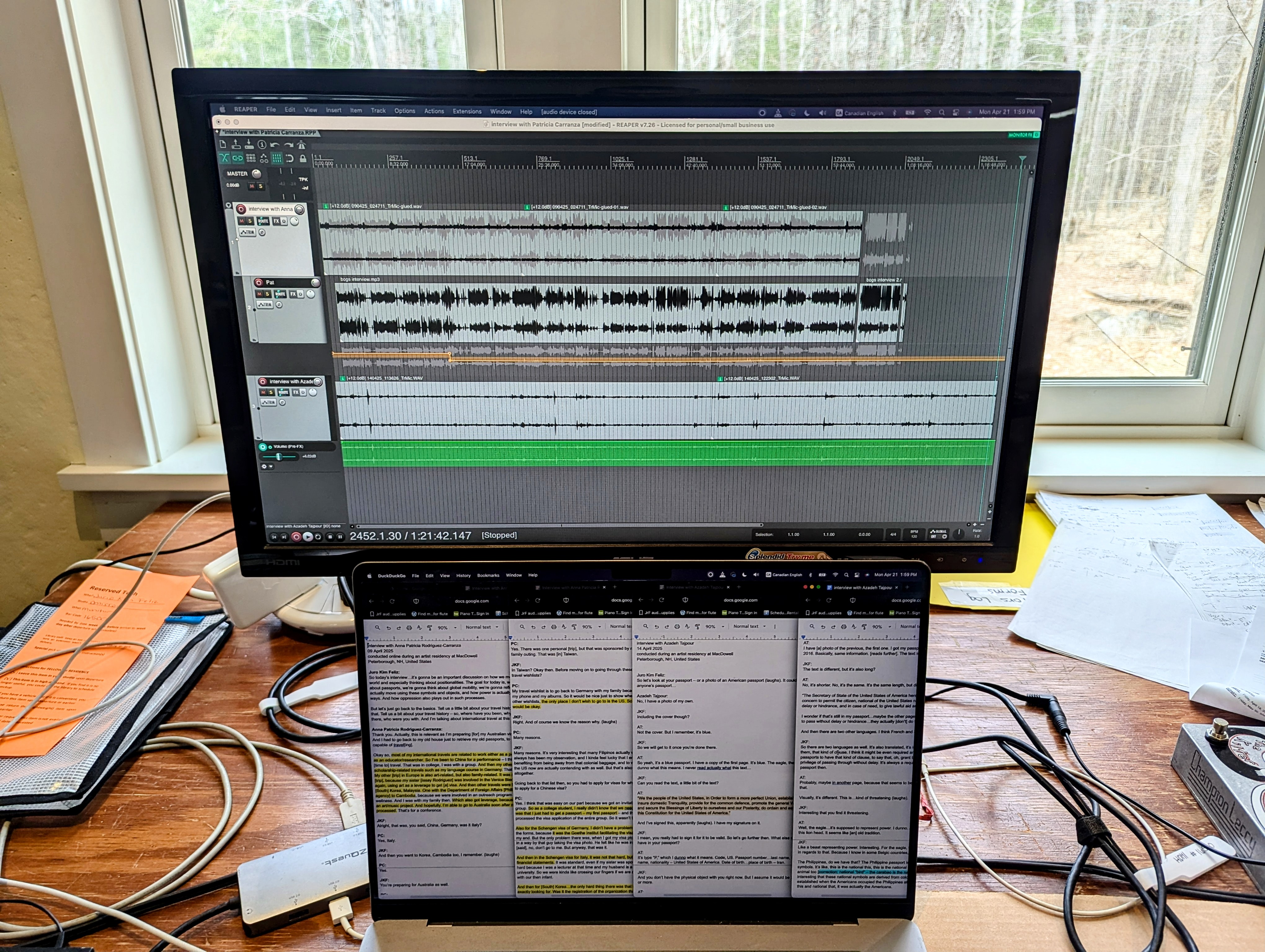 (1) My one-month Macdowell fellowship and artist residency (Peterborough, NH) in April and May was a nurturing and inspiring time. I finished writing a Musicworks article (one that was published during the summer). I did pre-compositional design work for two big projects. I recorded two interviews with correspondents for an upcoming musical work/audio essay. Talking to Patricia Rodriguez-Carranza and Azadeh Tajpour about passports and global mobility for this new work was a breath of fresh air to me, having personal experiences myself and trauma around holding a particular passport. These also rehashed my previous interview with Cedrik Fermont back in 2023 at Darmstadt — one that got published on Musicworks for Summer 2024. I made a goal to consolidate all three perspectives into one audio essay + live music, in conjunction with my magazine article publication. At this time, I’m no longer interested in branding this work as “Made in Macdowell.” The point is authenticity, truth, and the right timing to allow a work the maturity it deserves.