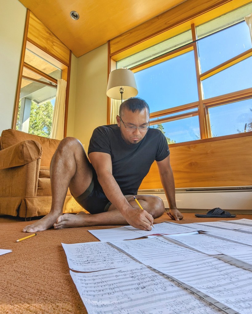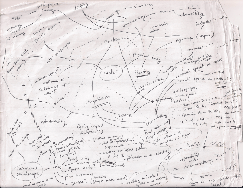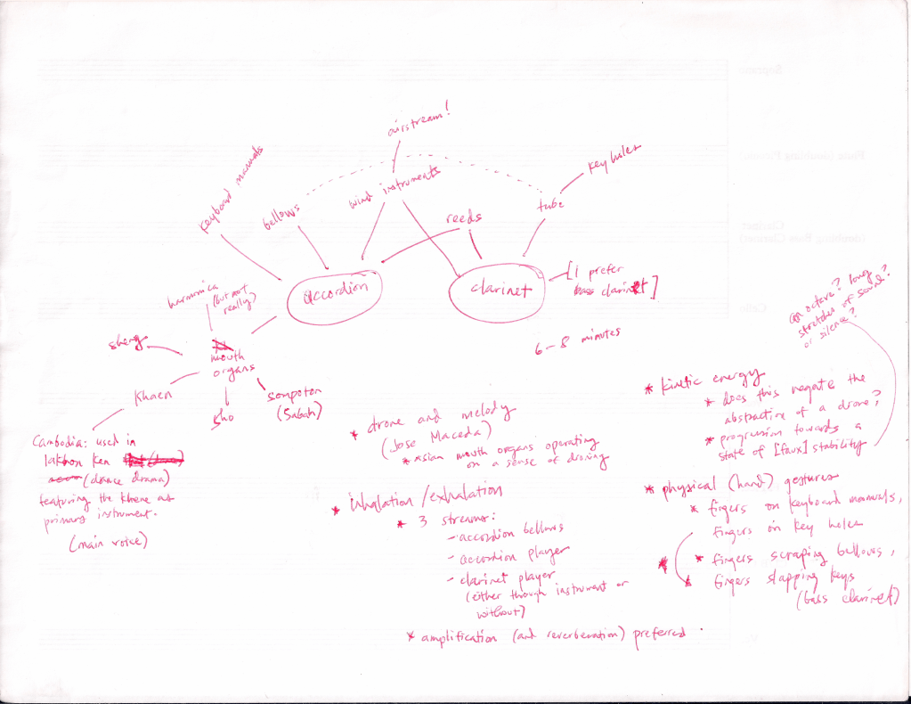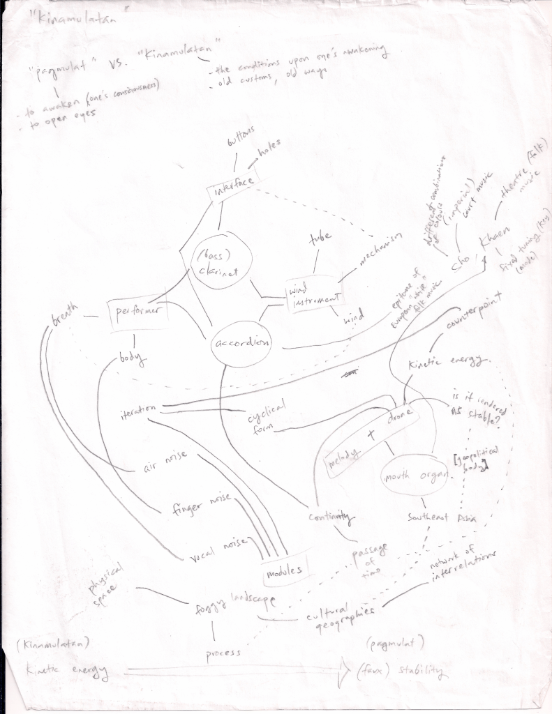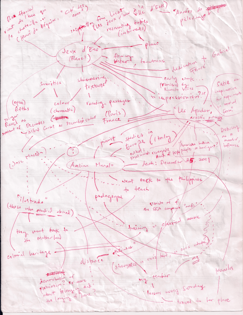 In many situations, mind maps are significant in my composition process. When I start a piece, I would think of a point of origin, unpack it bit by bit, start writing a map out of it, and draw networks and connections around what comes out. This unlocks the space of conceiving the music (sometimes directly, but mostly not). I had to decide when to stop, set it aside, and start creating the real thing. While not heard in the music per se, I find that this process adds spatiality to the work in question — the piece is never one-dimensional in nature.
