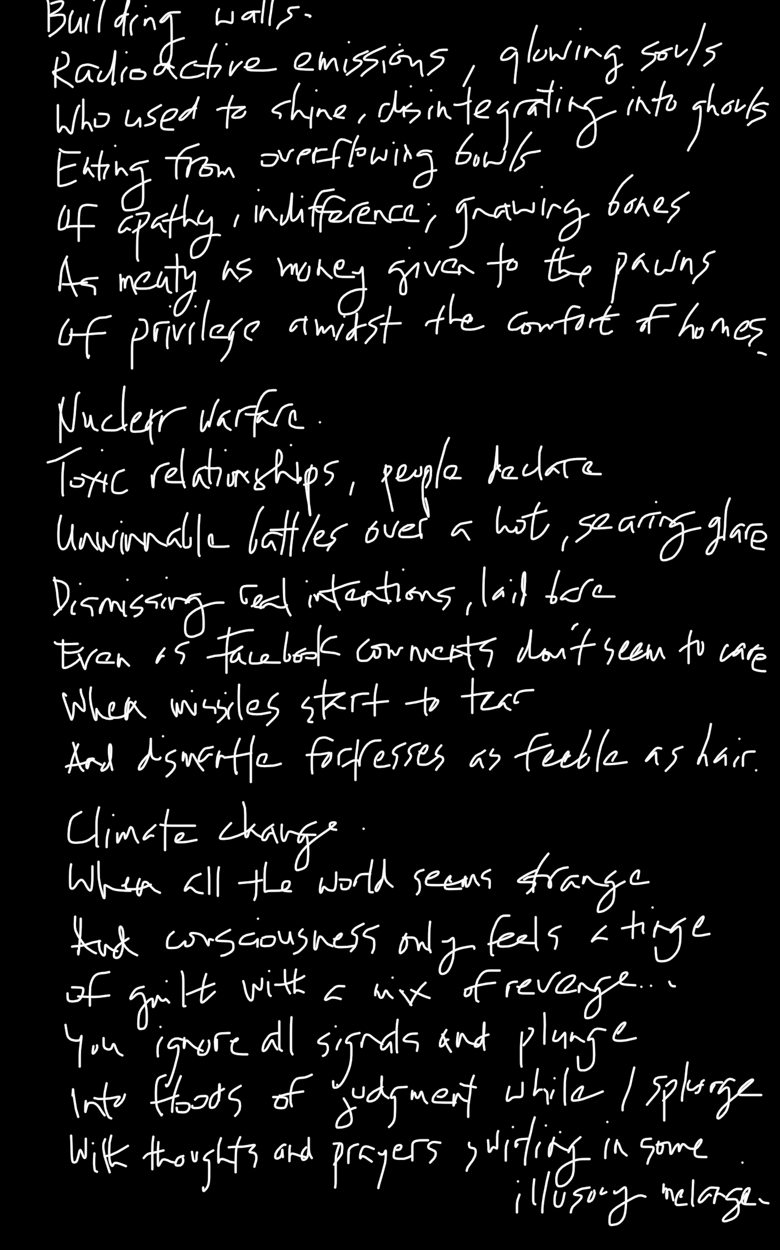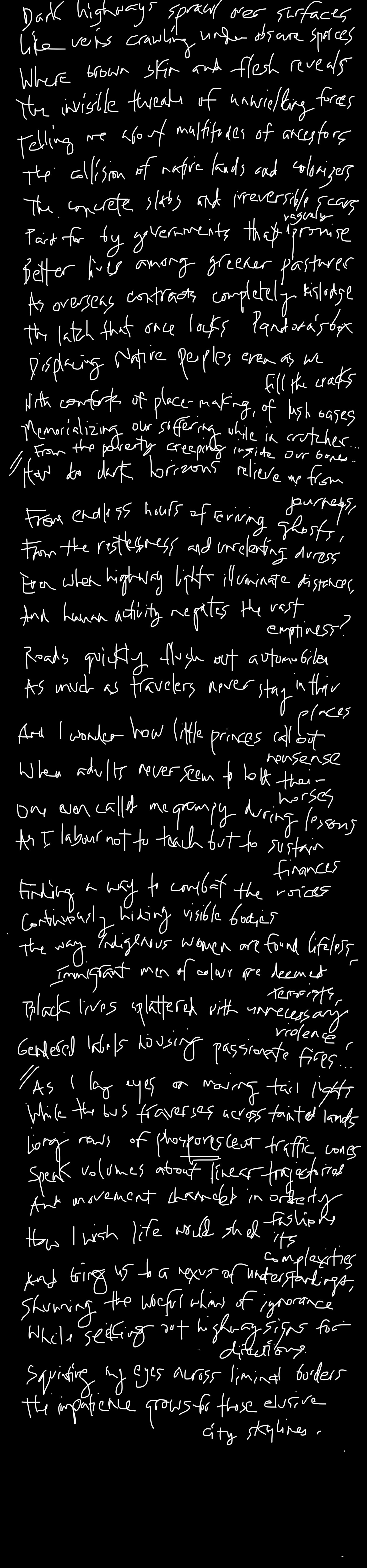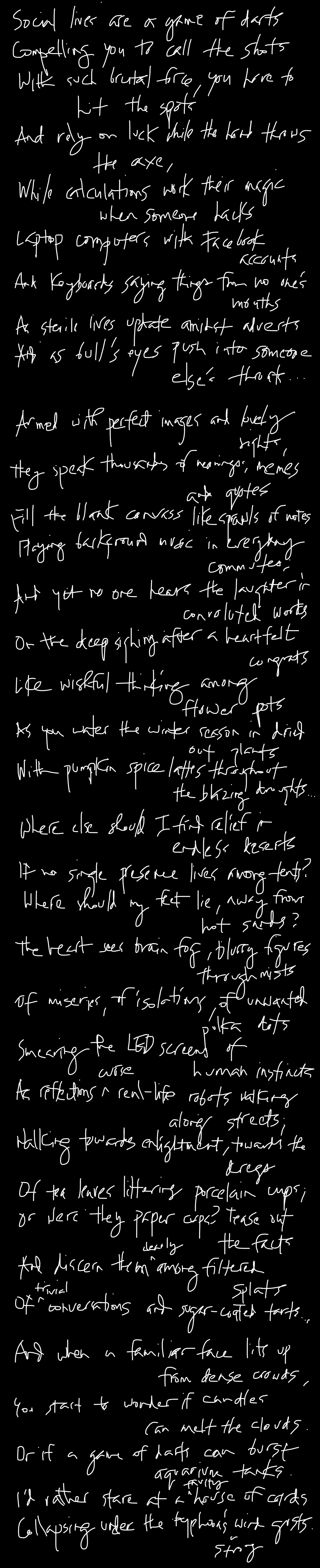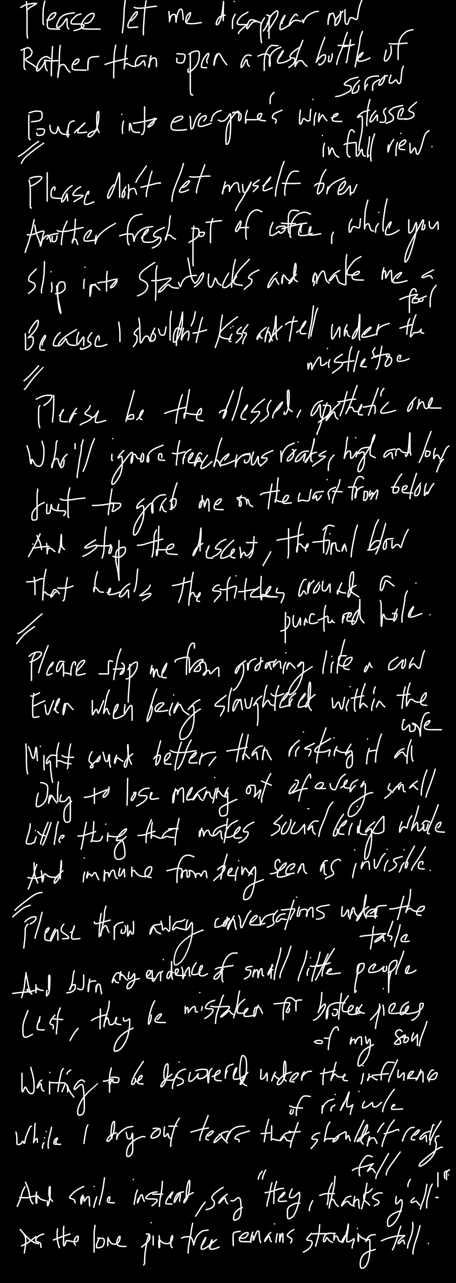 The year 2018 was a very difficult and dark time in my personal life – its repercussions still take effect as of today. I remember scrawling poetry with an old iPad in depressive moments of dreaminess or brain fogginess, whether during a long bus ride, sitting in a cafe, or hurting deeply while isolating myself in my room on my birthday. These notes were later unearthed from my backup files, and I have decided to put them here for future purposes.
